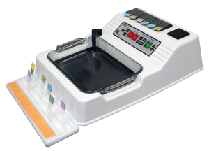 Each box has four trays in a double row configuration collectively capable of holding 2,000 slides