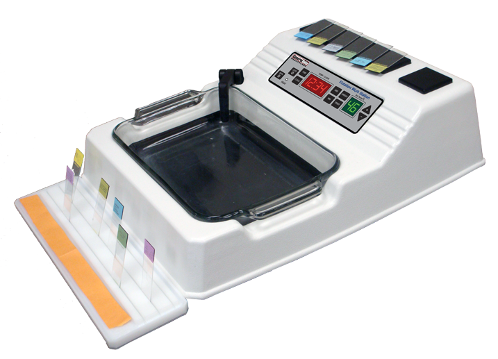 The small footprint FWS-S and TFB-S are ideal for crowded workspaces; the deep dish design allows for efficient ribbon floating and pickup. The FWS-L and TFB-L have an 8” x 11” removable glass dish. The FWS models feature builtin heated slide drying areas and a 2” x 2” HISTOorientor for removing wrinkles. All models have heat-resistant plastic housing and a low profile for user comfort.